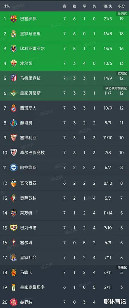 西甲直播,西甲赛程,西甲积分榜,皇马vs巴萨直播,西甲比分预测/为中文用户提供2025赛季西甲联赛全方位资讯:免费高清中文直播入口、赛程表、积分榜更新、皇马与巴萨动态追踪、竞彩推荐与比分预测。北京时间9月29日,西甲联赛第7轮上演了两场精彩对决,让我们一起来看看最新的积分榜变化。在焦点战中,巴塞罗那主场2-1力克皇家社会,继续保持赛季不败纪录,以19分超越18分的皇家马德里,成功登顶积分榜。另一场比赛,皇家贝蒂斯主场2-0轻取奥萨苏纳,暂时攀升至联赛第6位。