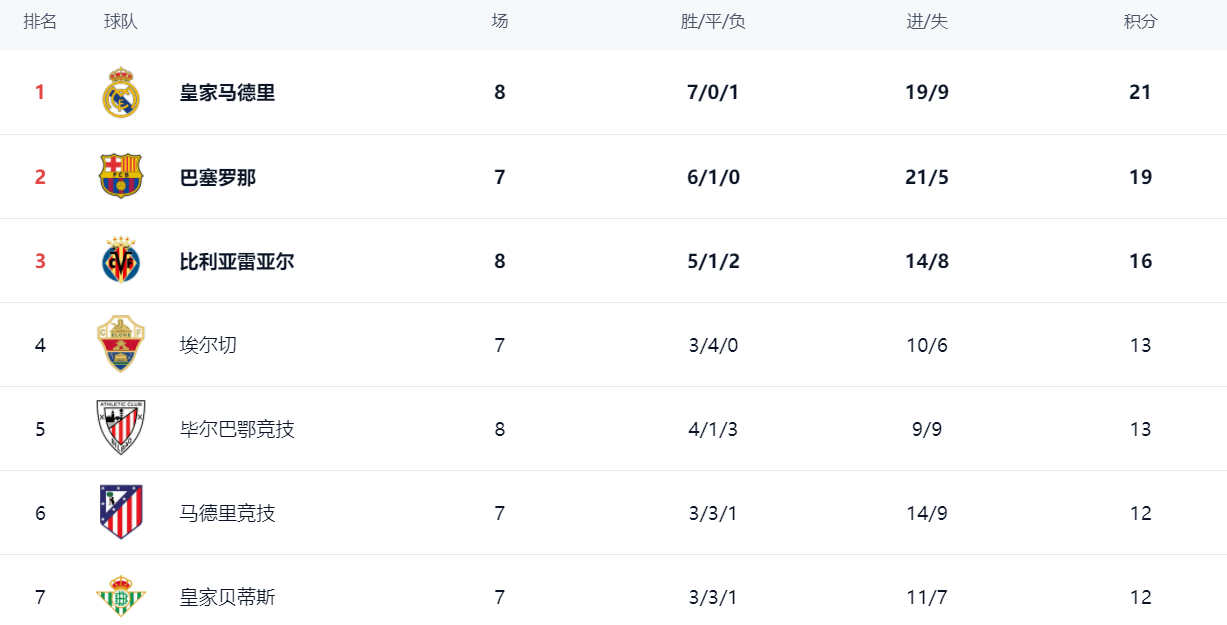 在积分榜上,皇马暂时登上了榜首位置。皇马拿到21个积分。而巴萨掉到第2名,只拿到19分。不过,巴萨比皇马少踢1场。比利亚雷亚尔输球之后,依然是16分,排名第3。埃尔切和毕尔巴鄂竞技都是13分,排名第4和第5。马竞3胜3平1负,拿到12分,排名第6。皇家贝蒂斯和西班牙人也是12分,排名第7和第8。返回搜狐,查看更多