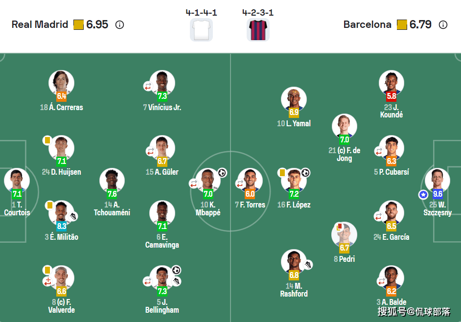 皇马首发:1-库尔图瓦(7.1分)、8-巴尔韦德(6.6分)、3-米利唐(8.3分)、24-赫伊森(7.1分)、18-卡雷拉斯(6.4分)、5-贝林厄姆(7.3分)、6-卡马文加(7.1分)、14-琼阿梅尼(7.4分)、15-居莱尔(6.7分)、7-维尼修斯(7.3分)、10-姆巴佩(7.0分)