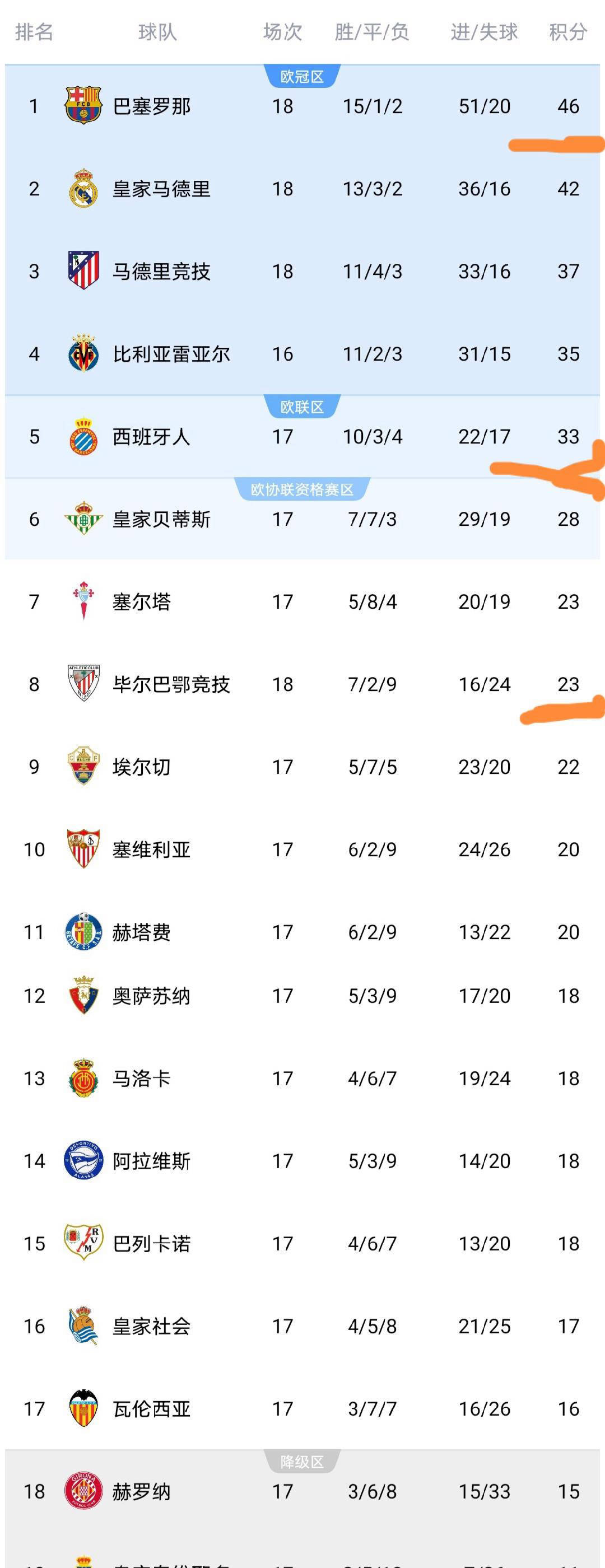 此外,第17轮其他比赛中,皇马和巴萨均以2-0轻取对手,巩固了各自在积分榜上的优势。贝蒂斯和埃尔切则分别打出4-0大胜,显示出极佳的火力。联赛中还有三场比赛以平局收场,整体竞争激烈而精彩。从积分榜来看,排名前列的球队实力明显,巴萨依然领跑,紧随其后的是皇马、马竞以及爆冷的比利亚雷亚尔,形成激烈的争冠格局。而积分落后的球队则显得较为挣扎,强弱分界清晰。