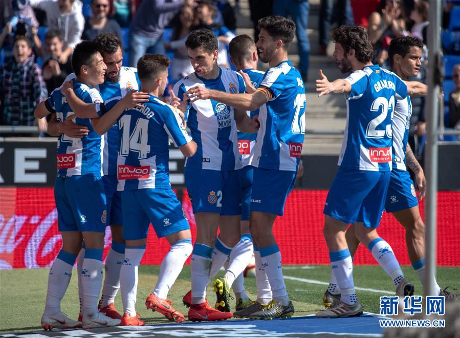 3月2日,西班牙人队球员武磊(左一)与队友在比赛中庆祝自己在西甲的首粒进球。 当日,在2018-2019赛季西班牙足球甲级联赛第26轮比赛中,西班牙人队主场以3比1战胜巴拉多利德队。中国球员武磊在本场比赛中攻入一球,收获自己在西甲联赛的首粒进球。 新华社发(胡安·戈萨摄)