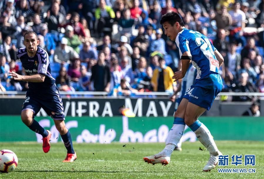 3月2日,西班牙人队球员武磊(右)在比赛中射门。 当日,在2018-2019赛季西班牙足球甲级联赛第26轮比赛中,西班牙人队主场以3比1战胜巴拉多利德队。中国球员武磊在本场比赛中攻入一球,收获自己在西甲联赛的首粒进球。 新华社发(胡安·戈萨摄)