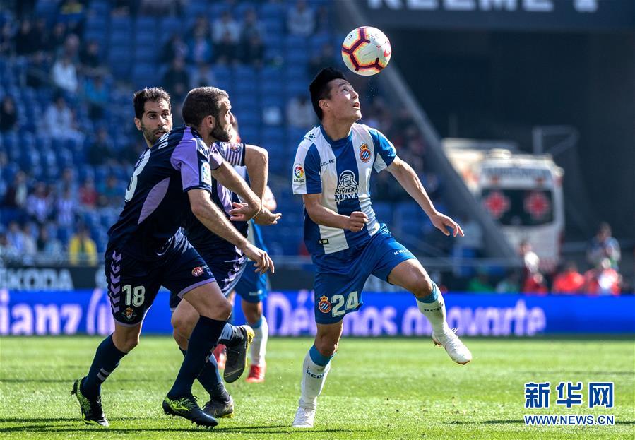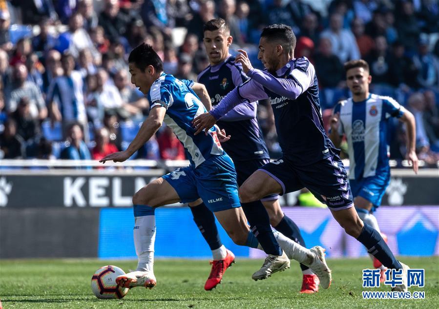 3月2日,西班牙人队球员武磊(右)在比赛中控球。 当日,在2018-2019赛季西班牙足球甲级联赛第26轮比赛中,西班牙人队主场以3比1战胜巴拉多利德队。中国球员武磊在本场比赛中攻入一球,收获自己在西甲联赛的首粒进球。 新华社发(胡安·戈萨摄)