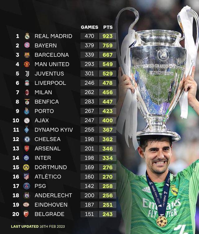然而,多年来我们的评价体系是否存在问题呢?是否完善和准确呢?让我们以欧冠为例进行探讨。在欧冠历史上,皇马无疑是最成功的球队,但成功有两种体现方式:夺冠次数和历史总积分。皇马在夺冠次数方面具有巨大优势,但第二种方式并不那么明显,尽管它可能比第一种更加准确。换句话说,欧冠历史总积分依然由皇马领先。
