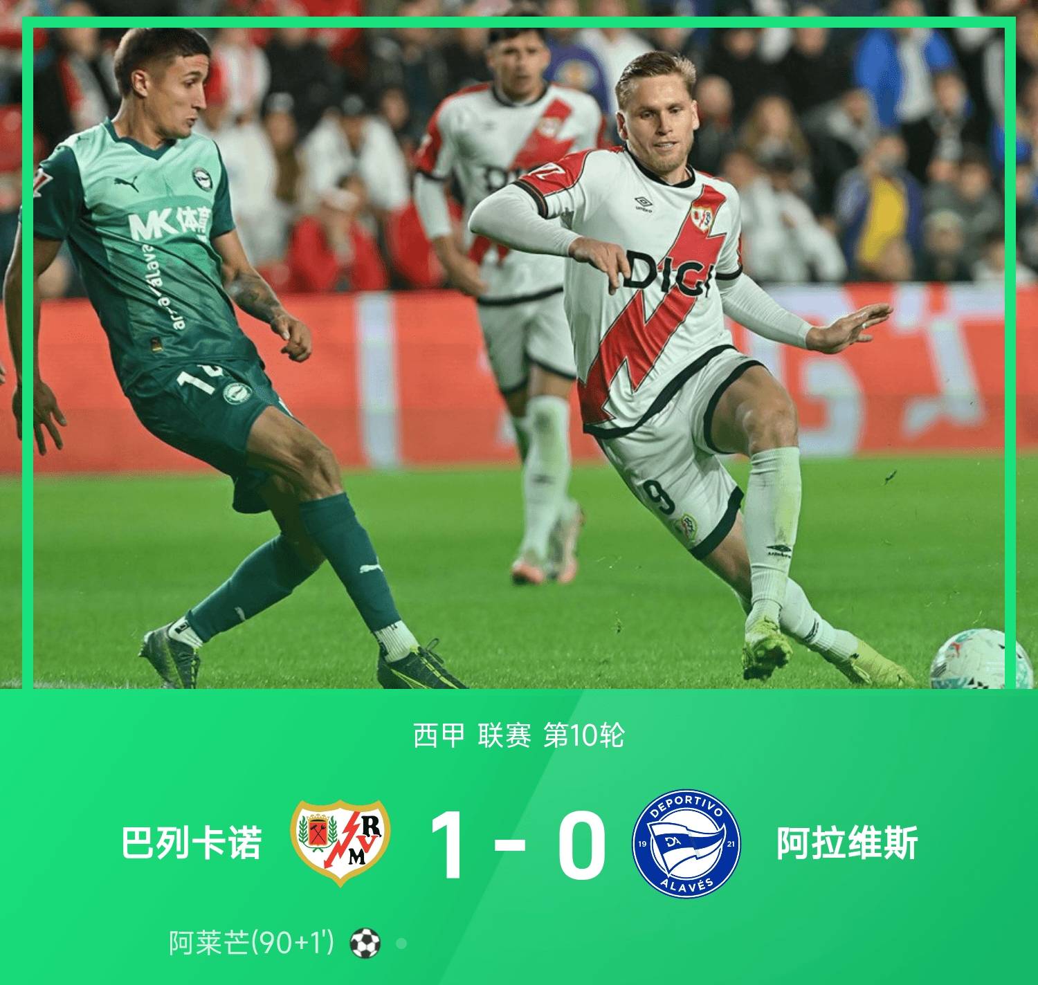 10月27日25/26赛季西甲联赛第10轮,巴列卡诺主场迎战阿拉维斯。上半时比赛场面极其沉闷,巴列卡诺的迪亚斯通过远射制造威胁。下半场两队易边再战,帕拉松反击起脚远射击中立柱,0-0的比分保持到全场补时第1分钟,查瓦利亚助攻阿莱芒鱼跃冲顶破门。凭借这个进球,巴列卡诺1-0击败阿拉维斯。