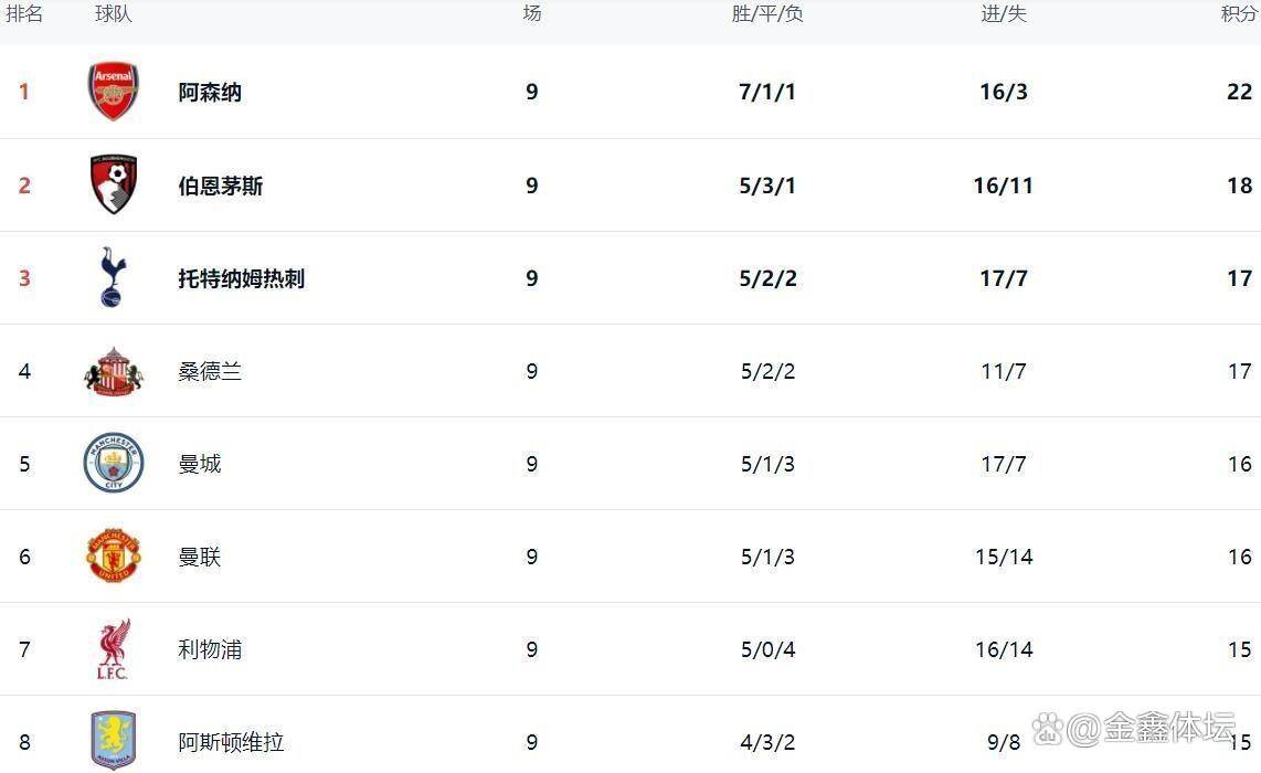 ”热刺的崛起更戏剧化,从中游蹦到前三,靠的不是球星闪光,而是全队玩命的高空争顶。 积分榜上,阿森纳22分第一,伯恩茅斯18分第二,热刺和桑德兰同积17分并列第三第四,曼城和曼联同积16分排第五第六,利物浦15分第七。 这乱局,每轮赛后都得重新认识英超。