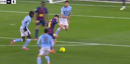 双方的攻防转换节奏极快,上半场补时阶段,巴萨从左路发起攻势,拉什福德强行突破杀入禁区,倒三角回传,塞尔塔球员莫里巴在回防时不慎将球踢到亚马尔脚下,亚马尔笑纳大礼,一脚劲射,皮球直入球门死角,巴萨在上半场结束前再次取得领先,比分变为3:2。