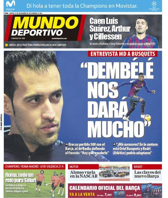 1、“登贝莱给我们带来了很多”,在接受《世界体育报》采访的时候,巴萨中场布斯克茨称赞了登贝莱,他表示要多给予登贝莱帮助,对于自己的接班人,布斯克茨选择了奥里奥尔-布斯克茨和马竞的罗德里。