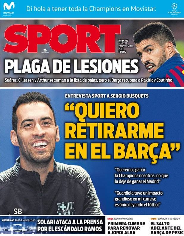 1、“我想要在巴萨退役”,巴萨的西班牙中场布斯克茨接受了《每日体育报》的采访,他坦言,“我们希望赢得欧冠冠军,并非为了阻止皇马连冠。瓜迪奥拉对我的职业生涯有着深远的影响,他是唯一的传奇。”