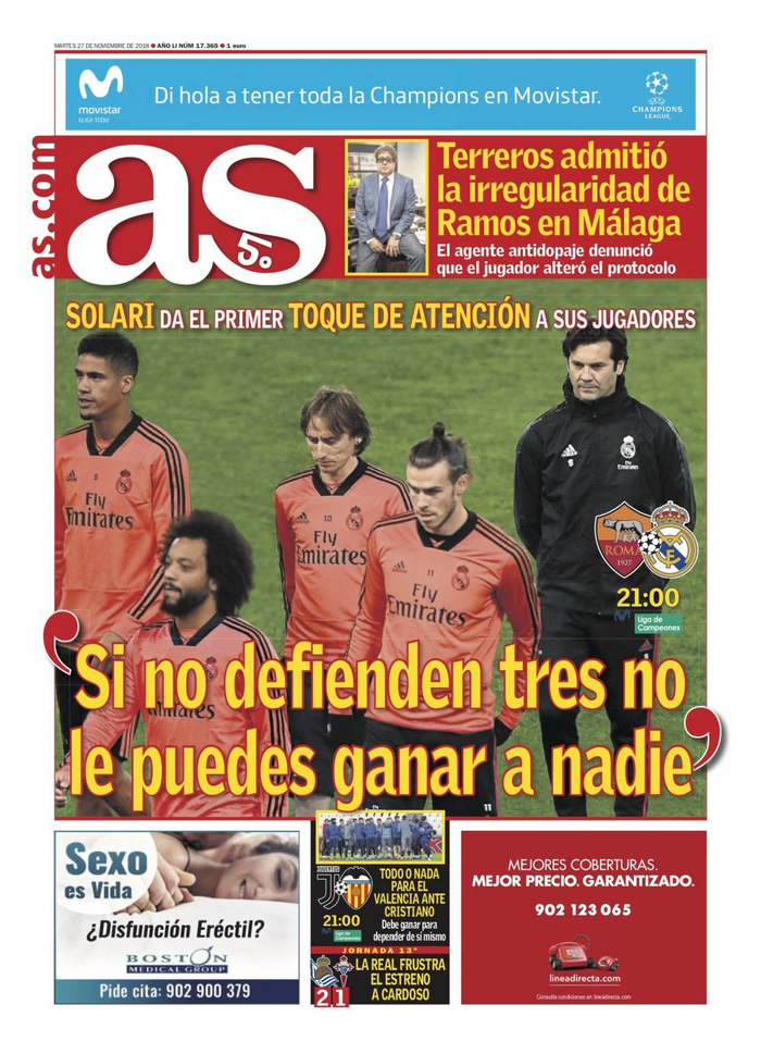 3、皇马将在当地时间今晚21:00客场对阵罗马,索拉里赛前对陷入争议的拉莫斯表达了支持。