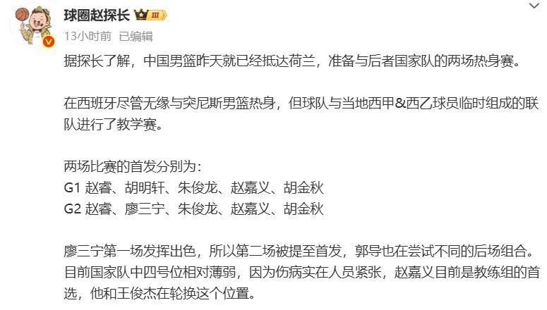 所以就还在集训的球员,至少有4人坐稳了首发位置,分别是赵睿、朱俊龙、赵嘉义和胡金秋。目前中国男篮已经抵达了荷兰,准备与荷兰男篮一队展开较量,总共有两场比赛,其中首场应该是公开直播。