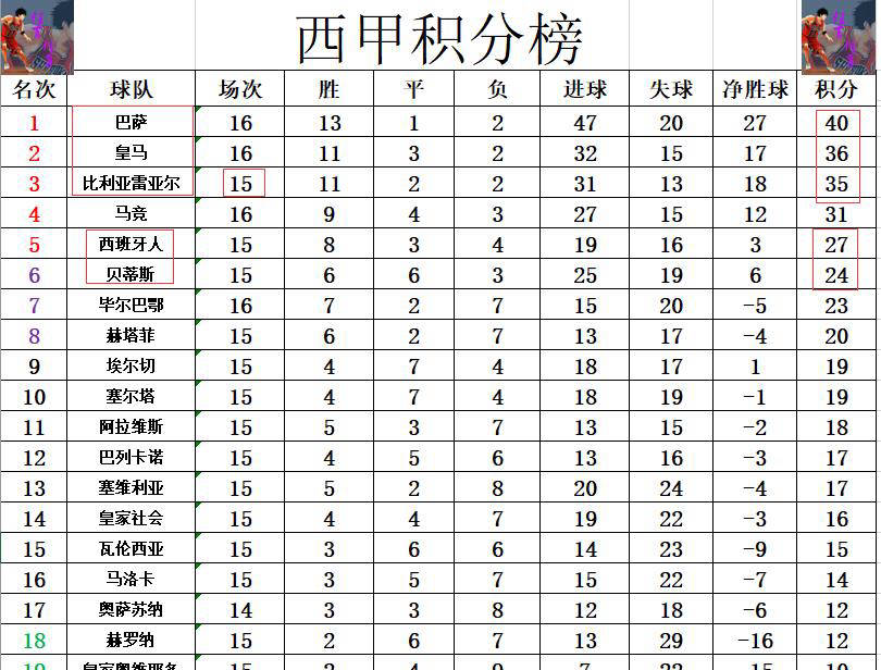 目前积分榜形势严峻。皇马近5轮仅拿6分,丢掉4个关键积分,而巴萨同期保持连胜态势,目前皇马已经从领先5分跌至落后4分,不仅失去榜首位置,多赛一场的情况下只领先第三位比利亚雷亚尔1分,连第二名的位置也岌岌可危。此外,西班牙人凭借本轮胜利跻身前五,超越贝蒂斯3分。